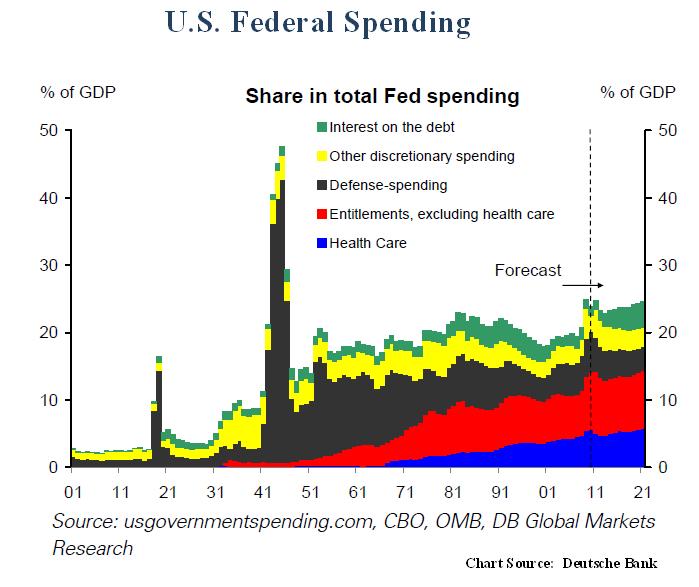 Great chart from Deutsche Bank showing a times series of U.S. Federal spending.  Note the “peace dividend” and decline in defense spending during the 1990’s, which was partially responsible for the Clinton surpluses.  The chart also illustrates where the reform and cuts need to come — entitlements and heath care.  Third rail.