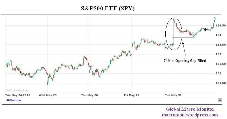A quick update on our earlier post on today’s S&P500 gap open. The SPY made an intraday low of $133.84 after its 0.93 percent gap up at the open at $134.77. This closed 74 percent of the gap, consistent with our post,