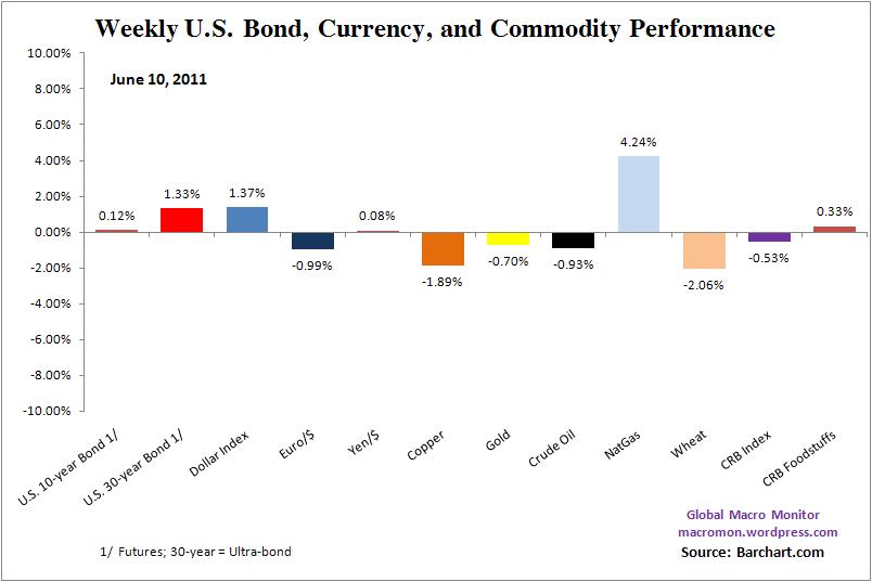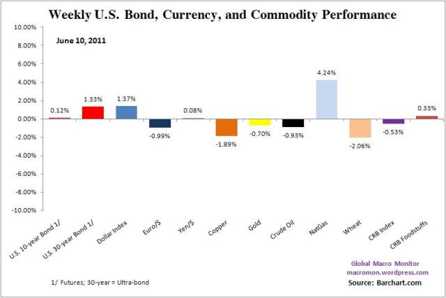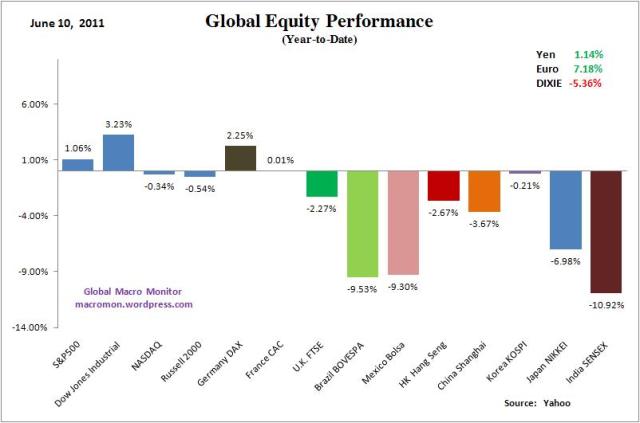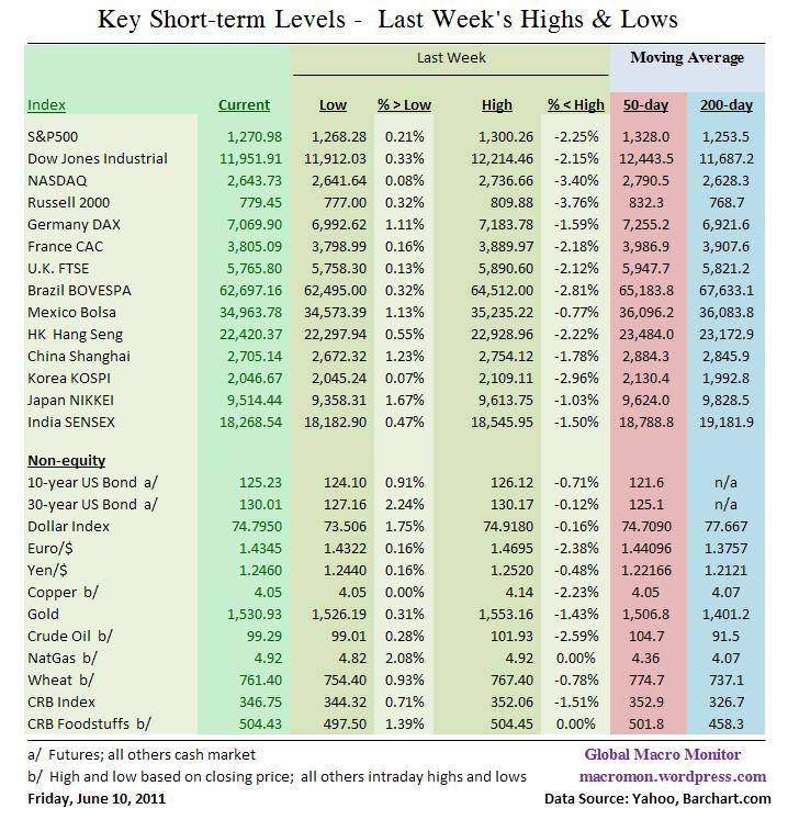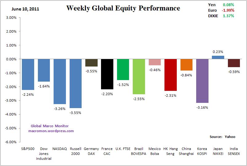 It was another tough week for the global markets. The S&P, Dow, and the major European equity indices closed lower for a rare sixth week in a row. Next week could be historic as the S&P500 has initially closed lower seven straight weeks only three times in the past sixty years. The many Macro Swans we have been writing about are weighing on the markets, including the end of QE2, China, Japan and the European Debt Crisis, which are slowing global growth and adding to worries about the upcoming earnings season. All the major equity indices were down for the week, excluding Japan, with the Russell, Nasdaq, and Kospi more than 3 percent lower. The Nasdaq and Russell are now down for the year.