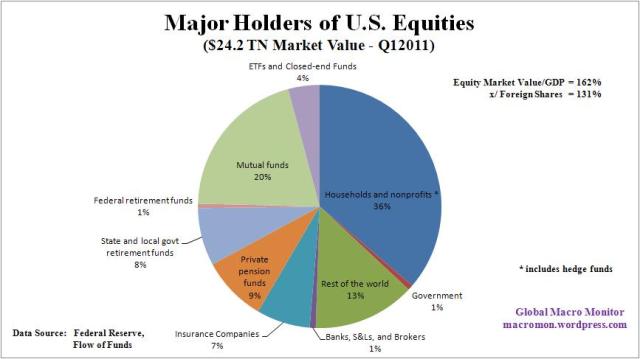 The following chart shows who holds U.S. equities, including foreign shares traded in the U.S.. at the end of March 2011. Notice that 36 percent of the market value of shares were held by the household sector. Our good friend, Charles Biderman of TrimTabs, does point out that the household sector includes “among other things, hedge funds, endowments, non-profit organizations, and direct purchases of equities by investors.” Furthermore, according to the Federal Reserve,
