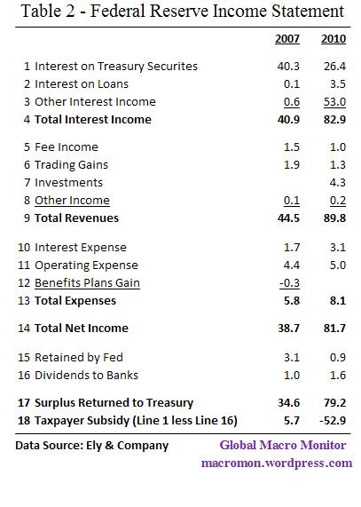 Table 2 shows the Fed’s net income has grown from $38.7 BN in 2007 to $81.7 BN in 2010 (line14). Though the sharp decline in interest rates reduced the Fed’s interest income on Treasuries from $40.3 BN to $26.4 BN, the more than $1 TN purchase of agency debt and MBS helped to generate $53 BN in interest income (line 3) in 2010, up from $.6 BN in 2007. The Fed returned $79.2 BN to the Treasury in 2010 (line 17) and after accounting for the $26.4 BN of interest on Treasuries generated a $52.9 BN profit for taxpayers.