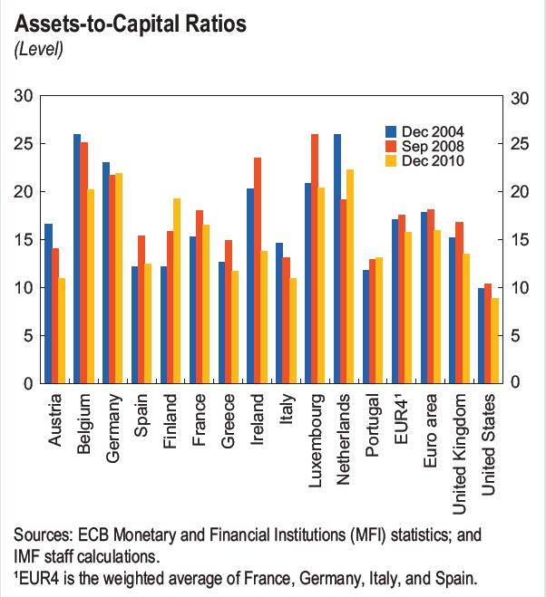 If a picture is worth a thousand words, the following chart from the IMF encapsulates all the analysis one needs to understand why Mr. Trichet and the rest of the Eurozone bureaucracy are so adamant about not letting Greece restructure its debt.  The leverage ratios of some of Europe’s country banking systems are nothing less than stunning.   At the end of the day,  it was Lehman’s leverage coupled with its overexposure to a declining asset class that brought it down.  Once the markets sniffed this Lehman’s liquidity was cut off and the rest is history.