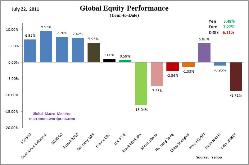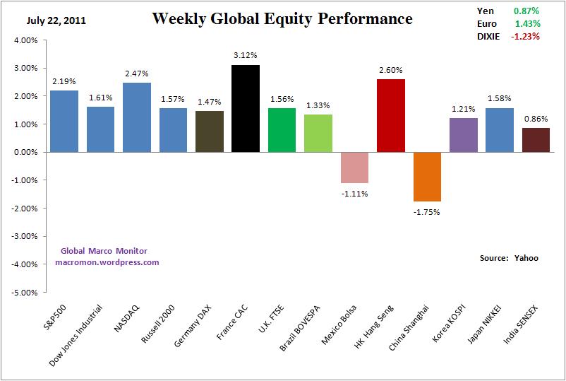 The CAC outperformed last week led by a relief rally in French financials, which were hit hard over fear of a sovereign default the prior few weeks. The massive rally in Greek sovereign bonds after the restructuring announcement helped spark a huge rally in European financials. We believe the Greece “Trichet Plan” is a big step in the right direction but many issues remain outstanding, including a more definitive resolution of Greece’s debt overhang. We find today’s Welt am Sonntag article that German banks were ready to write off 50 percent of Greece’s debt but met resistance from the French banks very interesting. We’ll have more on this later.