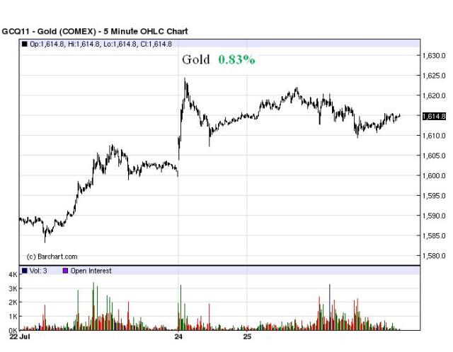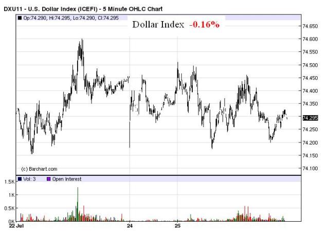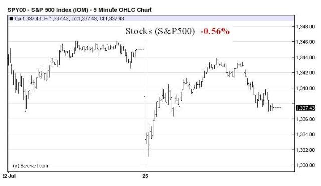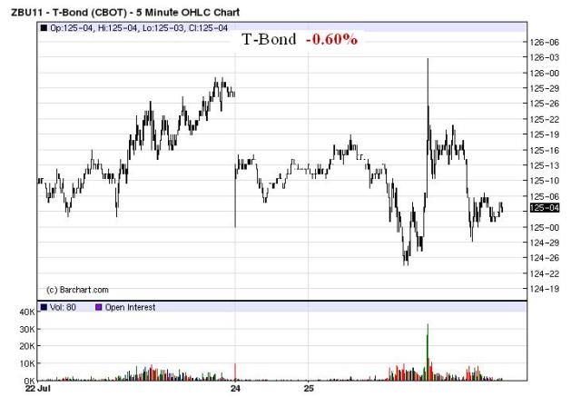 The following charts illustrate today’s performance of “The Four Horsemen” of our Armageddon trade, which we posted earlier. That is, the markets were monitoring for large concurrent moves which would signal a loss of confidence in the U.S. government and markets.
