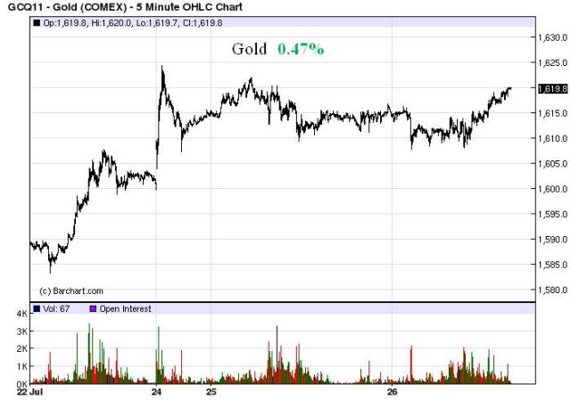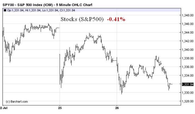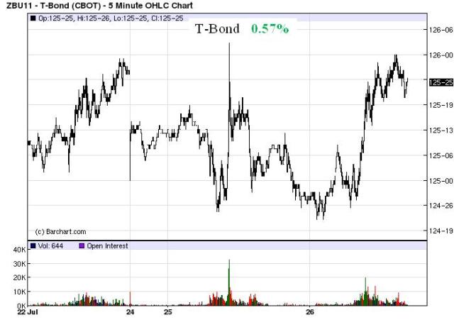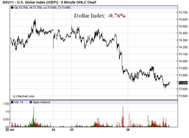 Still no panic, but lower.  The dollar took the biggest beating and looks ready to take out its May lows.  Only T-Bonds of the Four Horsemen of the Apocalypse moved contrary to what we call the Armageddon trade, where gold moves up, the dollar, stocks, and bonds move lower.   A large concurrent move in the Four Horsemen would signal a loss of confidence in the U.S. government and markets, in our opinion.