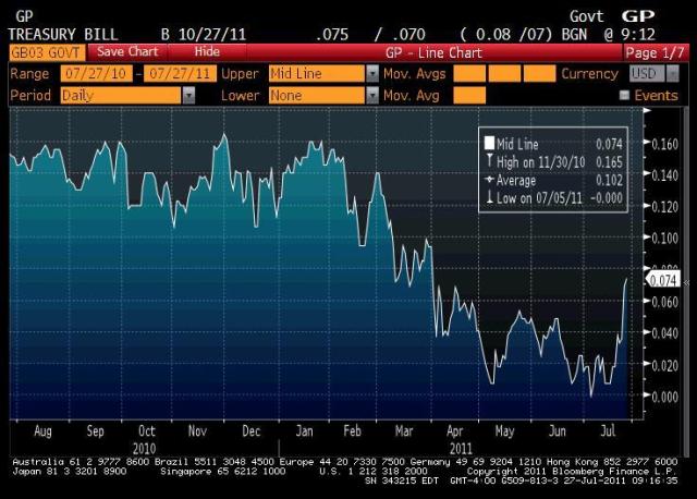 Somebody’s selling. That is a big move in a big market. The “freight from safety” trade on fears of credit downgrade may just be enough to light a fire under the arse of the politicos. We had a huge capital gain in 2007 on some T-Bill positions as they moved from around 2 percent to .15 bps in a matter of days. Imagine taking capital losses on T-Bills and the consequences thereof? To speak words the politico partisan class might understand, a spike in interest rates will be tantamount to a massive spending or tax increase.