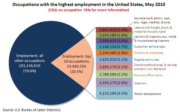 Retail salespersons and cashiers were the occupations with the highest employment in 2010. These two occupations combined made up nearly 6 percent of total U.S. employment.