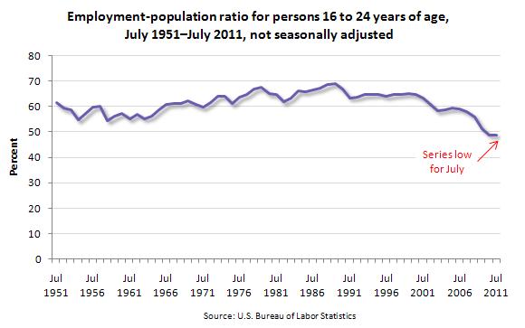 In July, the employment-population ratio for youth—the proportion of the 16- to 24-year-old civilian noninstitutional population that was employed—was 48.8 percent, a record low for the series.