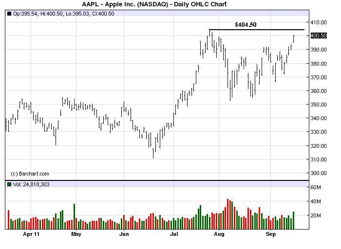 Apple closed over $400 for only the second time in history. The current market rally seems to be getting narrower and narrower with the large cap techs, such as Apple, leading the way. The stock, in our opinion, has the wind behind it to take out the all-time high, which is less than $5.00 above the close.
