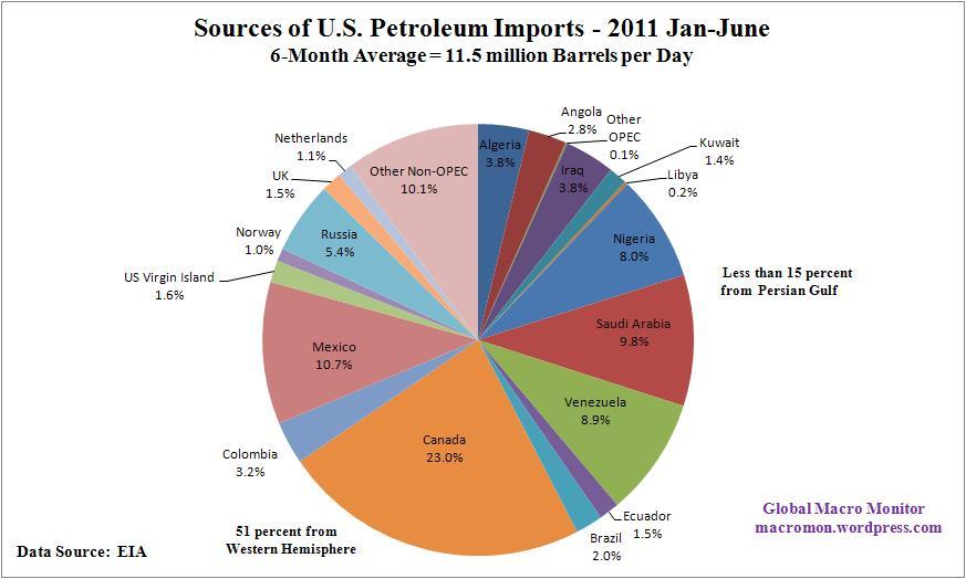 Ask most Americans the major source of U.S. crude oil imports and they will probably respond the Persian Gulf. Wrong! The chart below shows the U.S. imports less than 15 percent from the Gulf. More than 5o percent of petroleum imports come from the Western Hemisphere and is sure to grow.