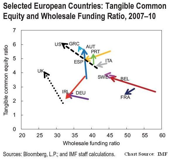The arrows indicate the direction of the data points from 2007-2010. It also illustrates how the U.S. and U.K. got religion about strengthening their banking systems after the financial crisis.