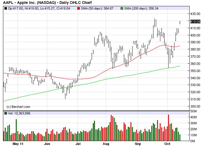Though there is still 2 hours of trading to the close, Apple is well above its September 20th all-time closing high of 413.45 and could easily ramp another $3 into close to take out its 422. 86 intraday high.