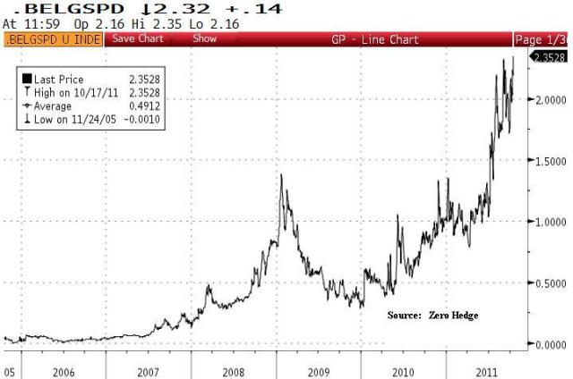 Over the weekend we posted a chart illustrating how French bond yields are blowing out.  Zero Hedge posted the following chart today illustrating the Belgium – German yield spread has just hit a new high.  ZH has been spot on and has not waffled in its conviction with respect to the European Debt Crisis.