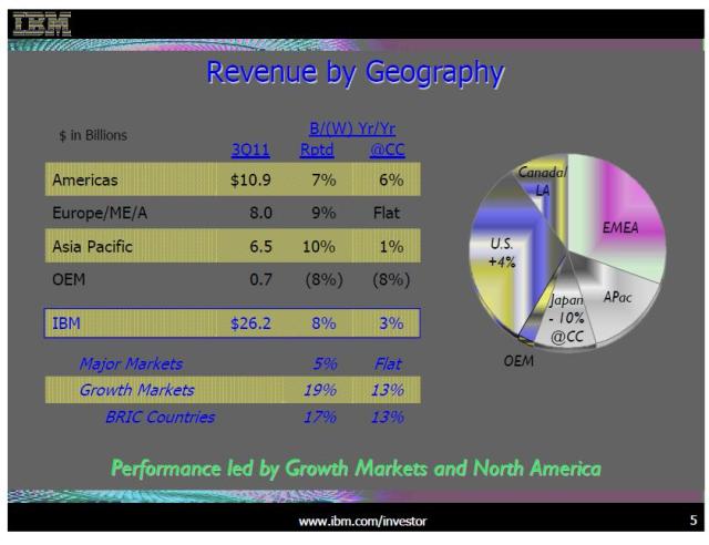 Our growth markets, again, had fantastic performance, outpacing the majors by 12 points. With 13% revenue growth, this is the fifth consecutive quarter of double-digit revenue growth in share gains compared to a strong third quarter last year. Performance was broad-based. As I mentioned, we had double-digit growth in 40 growth market countries including each of the BRICs. Our success is broad-based from a segment perspective as well. In fact, growth markets led the performance in each segment, with strong growth and expected share gains in GTS, GBS, Software and Systems and Technology. Within growth markets, we’re expanding into new countries and territories to reach new clients and enterprises. And so far this year, we’ve opened over 80 new branches…