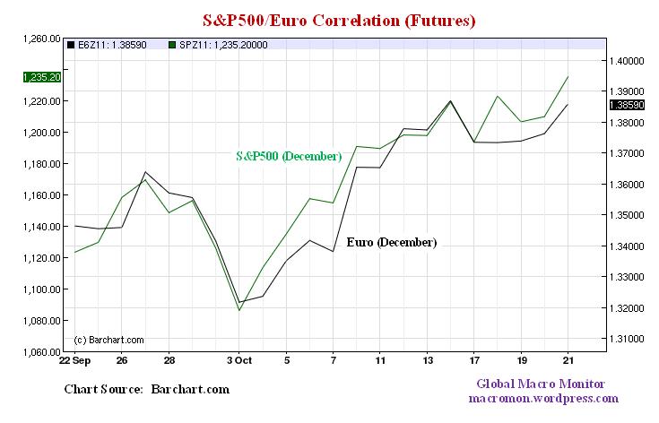 In case you haven’t noticed recently the Euro and S&P500 seem to be moving together almost tick for tick. Here are the daily moves in futures over the past month. Makes you think they’re both dancing to the same tune by the Algorithmics, no?