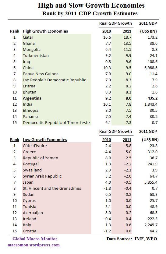 Here is the list we promised of the high/low growth economies ranked by 2011 GDP estimates. As we posted last night, the table illustrates that, of the large non-oil exporting economies, Argentina is the second fastest growing economy in the world. Not that it is a balanced non-inflationary sustainable trajectory, but the country’s default and currency devaluation, coupled with the huge positive terms of trade shock has contributed to the strong growth. Argentina is still battling with its creditors almost a decade after defaulting.