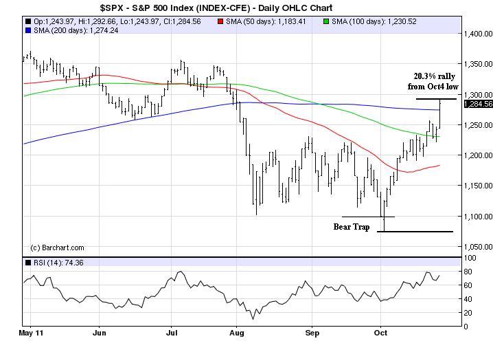 Stunning!  The S&P500 at its high today was up 20.3 percent from the October 4th intraday low of 1074.77. We’re talking the S&P500, not the Brazilian BOVESPA or Hang Seng Index!  This kind of initial move in the S&P500 in just 17 trading days has happened only six times in the past sixty years.