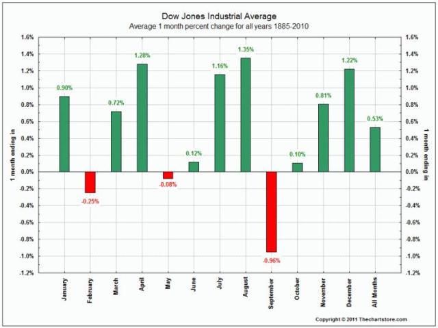 Tough to trade on historic average monthly returns. The chart shows that August has historically been the best month for the Dow.