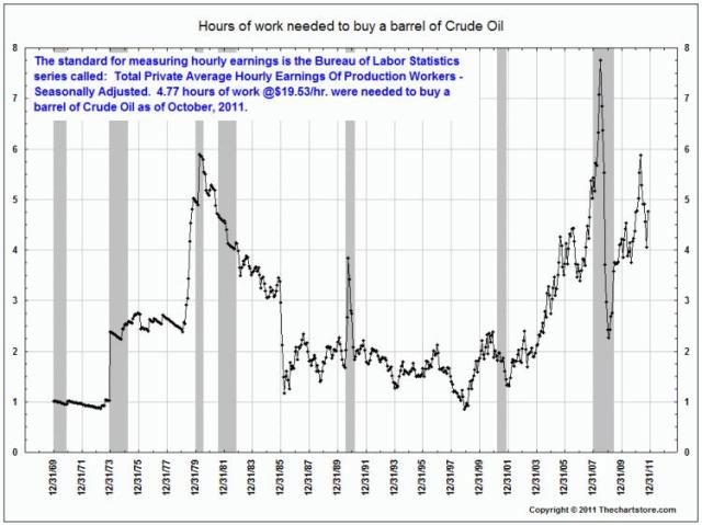 Another awesome piece of work from our friends over at The Chart Store. The chart below is a times series of the numbers of hours of work — based on the average hourly wage — needed to buy a barrel of crude oil. Given the current wage of $19.53 in October it now takes 4.7 hours of work to purchase a barrel of crude. Add another couple of hours when Iran heats up.