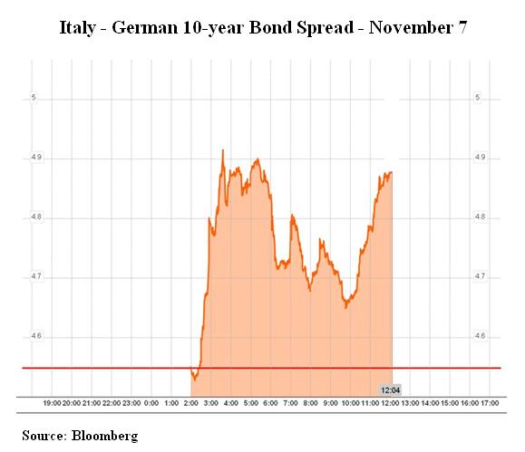 With G-Pap now gone Club Med is in the midst of their own Arab Spring. Today’s jump in Italian yields with the credit curve looking to invert soon – a signal of growing default worries – is a clear call for Silvio Berlusconi’s head. The guy is a proven survivor and has weathered 51 votes of no confidence in the Italian parliament, but we think it’s only a matter of days, if not hours, before he goes. Hopefully replaced by a government of technocrats (see the Big Picture for background).
