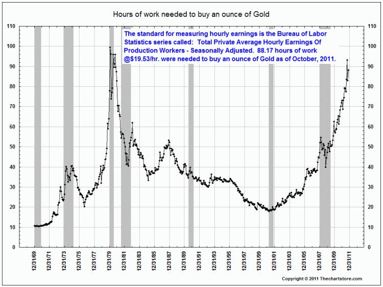 More great work from our friends at The Chart Store.  It now takes over 88 hours of work at the average hourly wage to buy an ounce of gold.   What an incredible increase in the relative price of gold and loss of confidence in fiat currency.   Sorry, PK,  it ain’t just about Glenn Beck’s marketing campaign.