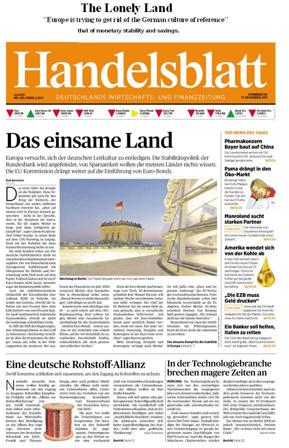 The question is:   what will happen to German money demand if the ECB is forced/resorts to massive monetization of periphery sovereign debt?    Just as confidence in a sovereign’s credit worthiness can evaporate quickly, so to can confidence in a central bank.   As the Hadledsblatt states below monetary stability and savings is part of the German culture.