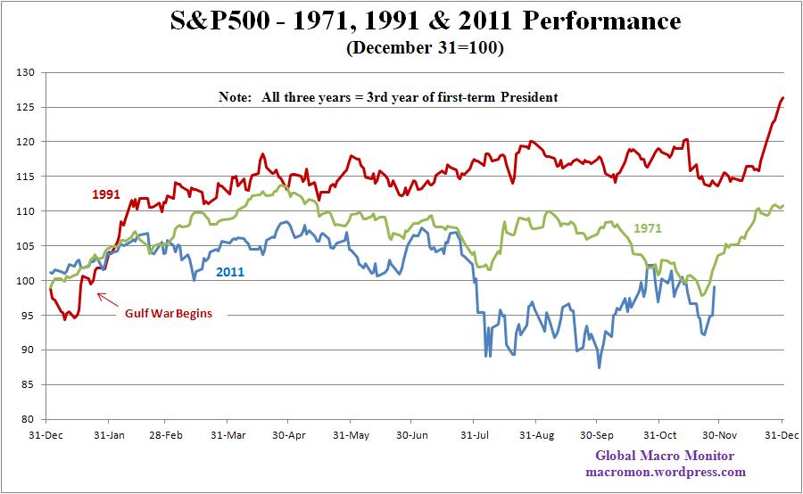 The Global Macro Monitor posted several pieces earlier in the year about the Presidential Stock Cycle. See here, here, and here. The third year of a first term President is the strongest year in the cycle. The table illustrates that if the S&P500 doesn’t close at 1257.64 (closed today at 1246.96) or higher, President Obama will be the first post-war “Investor in Chief” to have a S&P500 down year in the third year of his first term.