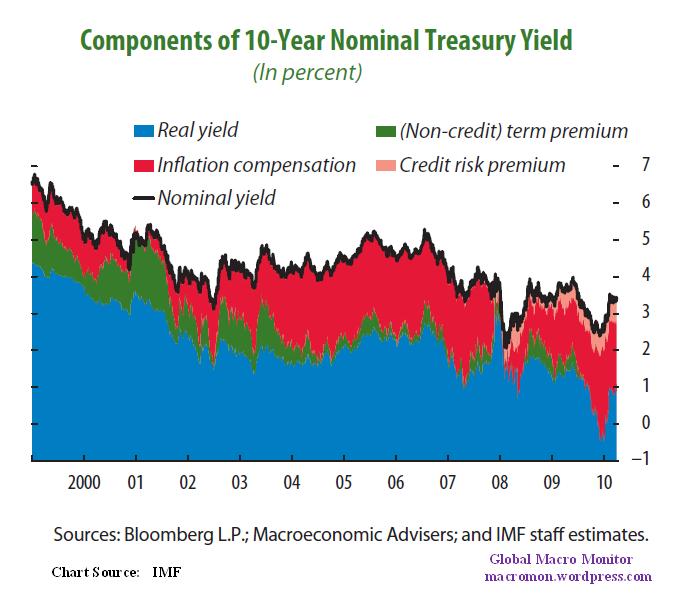 Unfortunately, it’s very difficult to decompose the various risk premia in a sovereign bond yield. The IMF made a valiant effort with the 10-year U.S. Treasury yield in 2010. Note the credit risk premium entering the picture after the bursting of the credit bubble in 2007/08.