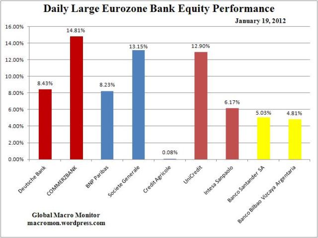 Wow! Check the moves in the large Eurozone bank stocks today and for the week. And, unlike the U.S. market, on heavy volume. Euro sovereign spreads are a bit tighter on the week with the exception of Portugal, which Standard and Poor’s relegated to the junkyard last Friday.