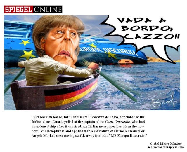 Spiegel posted this cartoon which appeared in an Italian newspaper portraying the German Chancellor Merkel caricature and likening her to the captain of the capsized Costa Concordia.