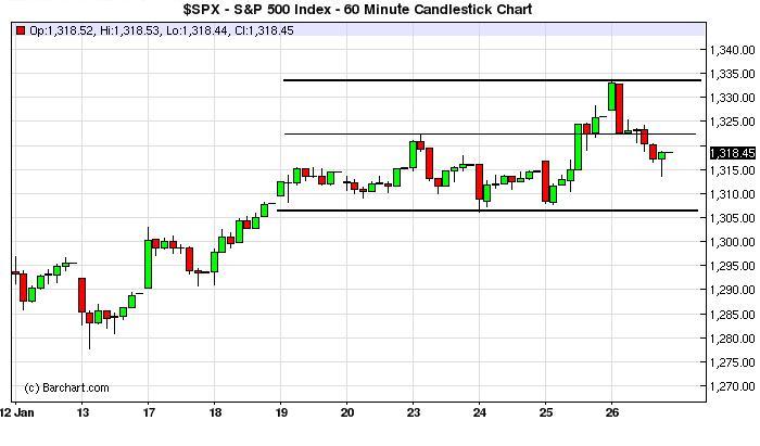After breaking through its relatively tight short-term trading range on yesterday’s Fed announcement, the S&P500 ran out of gas at 1333. Our best guess is that in the short run the S&P500 trades in a range of 1306-1333 as it tries to work off the overbought condition.