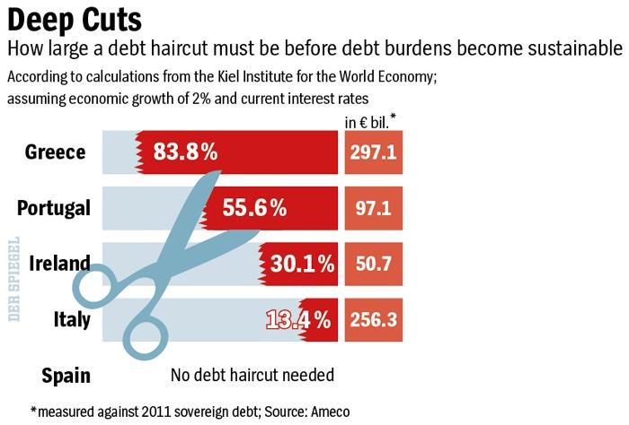 Interesting calculations posted by Spiegel from the Kiel Institute on the sovereign haircuts which would make the debt of the listed countries sustainable. We would love to see the calculations for the U.S., U.K., and Japan.