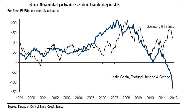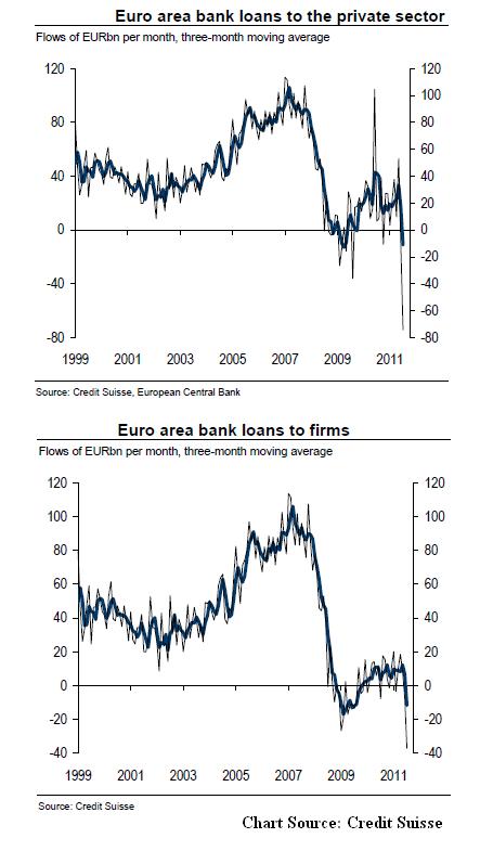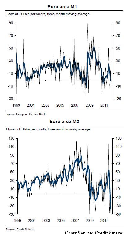 Here are some great pictures from Credit Suisse illustrating what’s happening in the European monetary sector. The monetary aggregates have been collapsing at a greater pace than 2008/09 as banks have been cutting credit and shrinking their balance sheets to meet capital ratios. The European bank run, which really accelerated in the core in the second half of last year was a major contributor to the monetary contraction and loss of confidence by the banks.