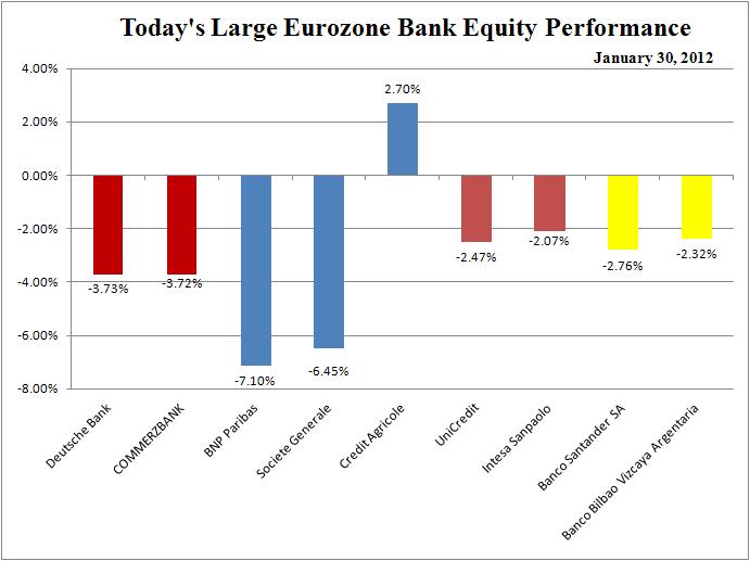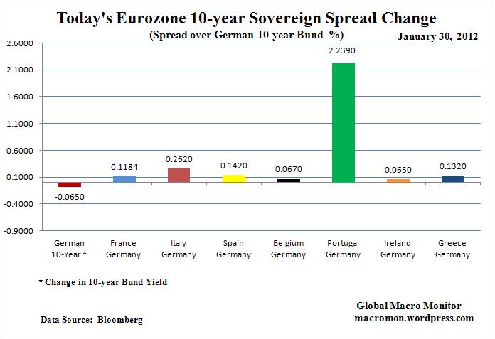 The foul mood spills into Europe. The Portugal-Germany 10-year bond spread blows out over 200 bps; investors/traders use Sarkozy’s transaction tax announcement and Portugal to spank the French banks hard; the media noise kicks up several decibels as a Greek PSI deal has yet to be announced. All this with a backdrop of extreme overbought markets where some 14-day RSIs are north of 80!