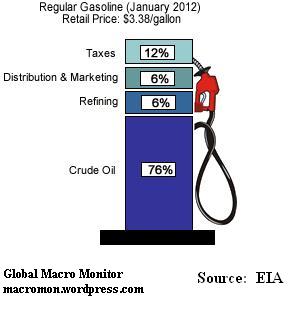 Note 76 percent of the price for a gallon of gas is driven by crude oil. Only 6 percent by refining and 6% distribution and marketing. Though these components do vary over time, but not by much.