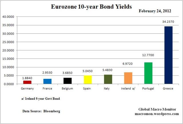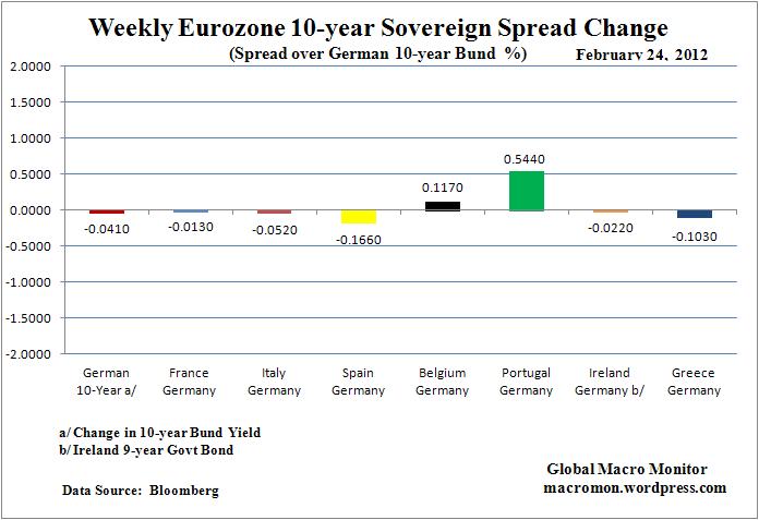 Q: How does the market respond to all the doubts and scepticism about the second Greece bailout? A: They tighten Italian and Spanish spreads and take the Euro higher, although Portugal did widen on the week.