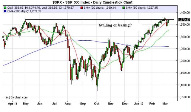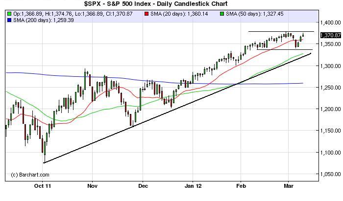 Short-term the S&P500 is in a trading range of 1340-1378 and looks to be working off severe overbought conditions with a healthy consolidation. This seems to be the pattern of the 20+ percent move since October – a strong move up followed by a few weeks of range bound consolidation. The bears will seize on the longer term chart and warn the index can’t seem to break through last year’s high.
