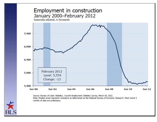 Take a look at construction employment. Now you know why the President’s political handlers are so desperate to get the housing market turned around. Normally lower interest rates stimulates the construction and leads the economy out of recession. This time is different as the monetary transmission mechanism is broken due to the legacy of the credit and housing bubble.