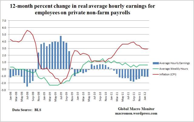 This evident in the second chart and one that should concern President Obama. Though job creation has picked up, real wages have not. In fact, isn’t that a big part of why hiring has increased? As real wages fall (prices) demand for labor increases?