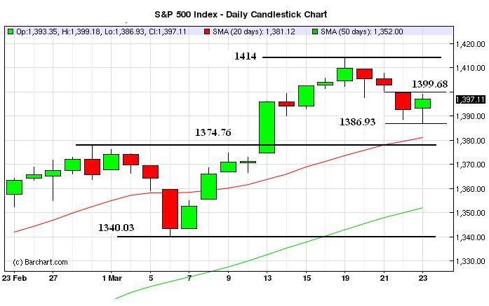 1399.68– Thursday’s high. Only a couple points higher, but a close above this level will pave the way to test the 1414 recent high;