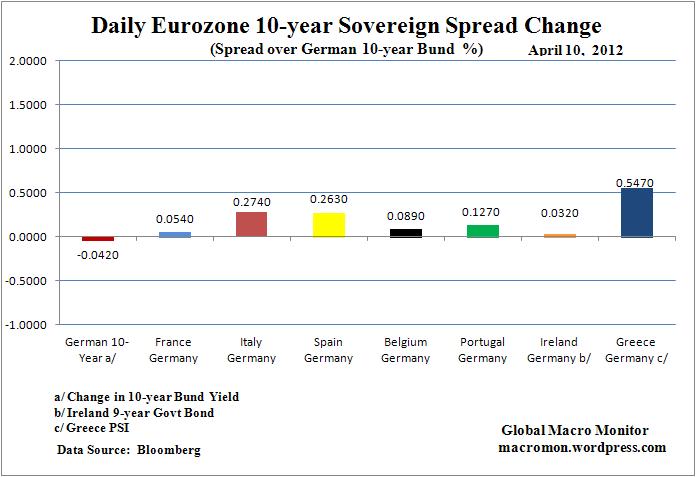 Spain’s sovereign spread over German bunds blew out 26.3 bps and is within 40 bps of its November high, while Italy moved 27.4 bps wider. The large eurozone banks got thumped (see chart), the CAC 40 broke its 200-day moving average, and the German DAX was down more 2 1/2 percent.