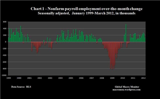 Today we have a couple of background charts looking at the change in monthly nonfarm payroll employment from January 1999 to the most recent data of March 2012.