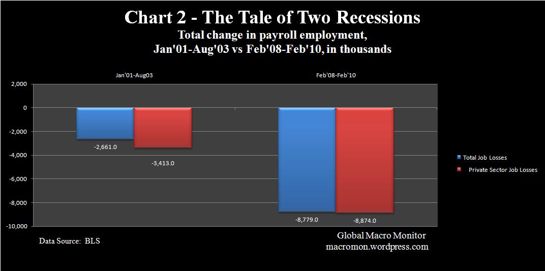 Total job losses in the two recessions are then juxtaposed in Chart 2. Note that more than 3x more jobs were lost in 2008-10 than in 2001-03.