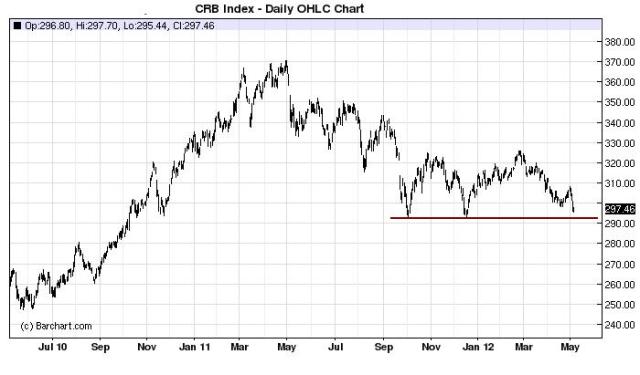 The CRB Index looks ready to break a key support level which has held twice at around 293. The index is heavily weighted with crude oil, which experienced an ugly reversal and was down over 6 percent last week.