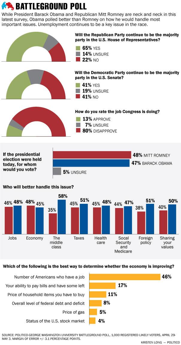 But there are suggestions that these numbers are extremely fluid: Obama holds double-digit leads over the presumptive Republican nominee on issues such as who will better handle foreign policy and who will stand up for the middle class and on “sharing your values.” But enduring concern about the economy — by far the most important issue to voters — keeps the president in a tenuous position despite employment numbers that show slight but steady improvement.