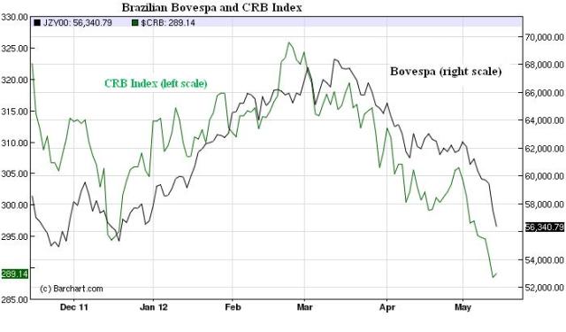 No doubt there are many reasons for the slide, but it feels to us, it is more tied to the China slowdown and collapse in the commodity complex. Though most equity markets are moving with commodities, note the close movement of the Bovespa with the CRB Index in the chart below. Listen to the markets and stay tuned.
