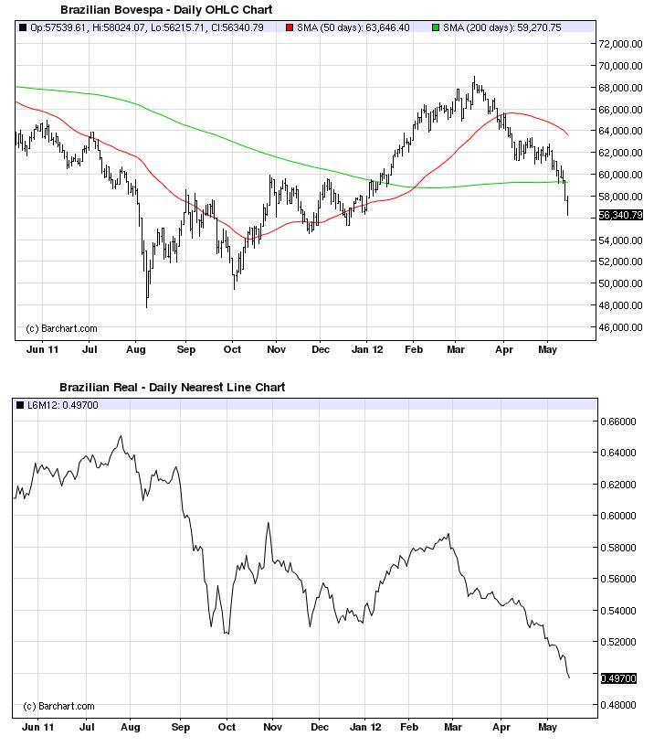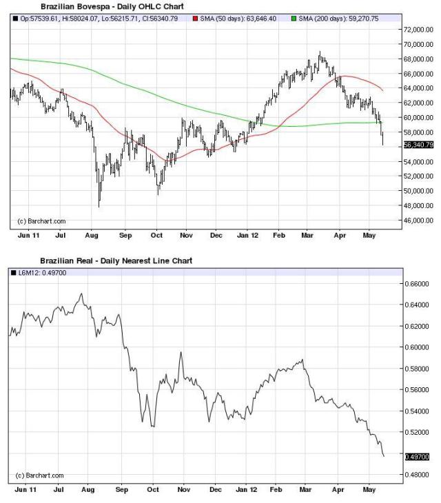 After leading global equity markets for the first two months of the year, the Brazilian Bovespa has fallen like a BRIC since hitting its 68,970 high on March 14th. We noted the index broke its 200-day yesterday and with today’s close is negative for the year, down more than 18 percent from the March high. Surprising given the currency has weakened significantly, which is big red flag in our book.