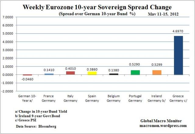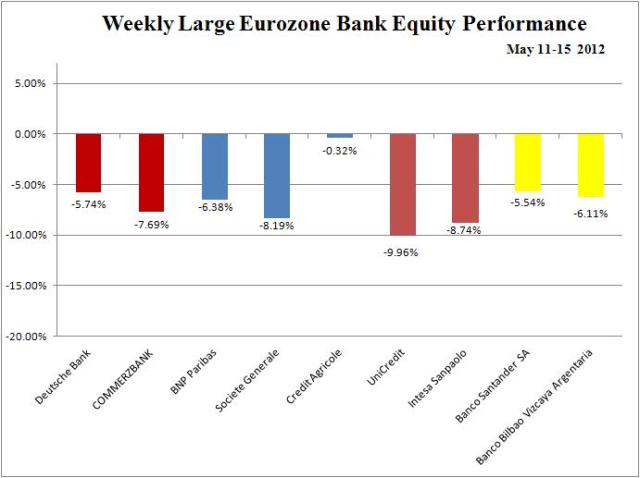 The charts reflect the change in sovereign spreads vs the German Bund and bank stock performance for the first two days of this week.