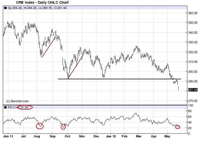 Commodities are breaking hard. Who knows where they bounce, but it does feel a bit overdone here. Note the chart illustrates when the CRB is this oversold — an RSI reading of around 20 — it sets up for a nice bounce.