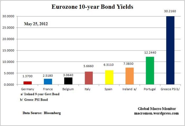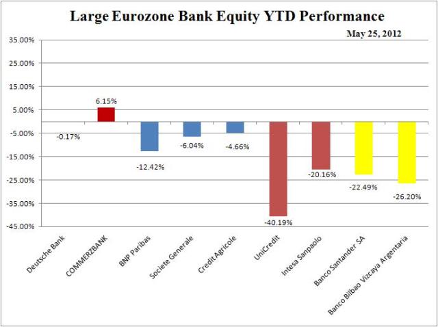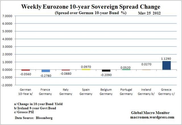 Comment: Euro market x/ currency had a relatively benign week given the ugly headlines. Also note x/Spain and Greece all sovereigns tighter vs. Bund on the year. Looking at this data either our Eurogeddon fears and emotions are exaggerated and wrong or the market is wrong; and/or the ECB is doing a decent job containing the crisis to Greece and Spain, at least for now.